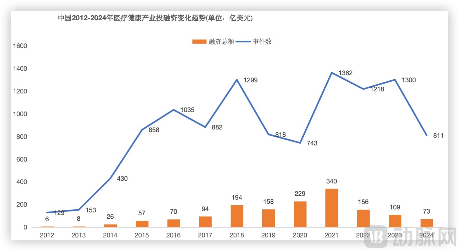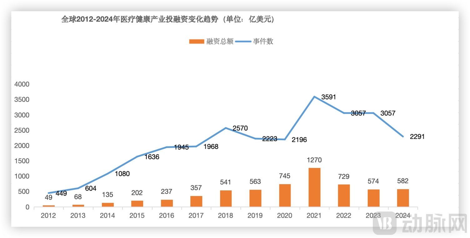 全球2012-2024年医疗健康产业投融资变化趋势,数据来源:动脉智库