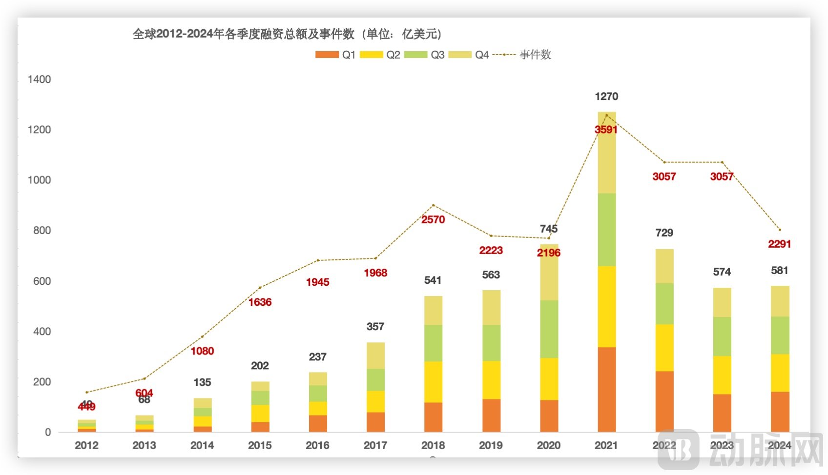 全球2012-2024年各季度融资总额及事件数,数据来源:动脉智库