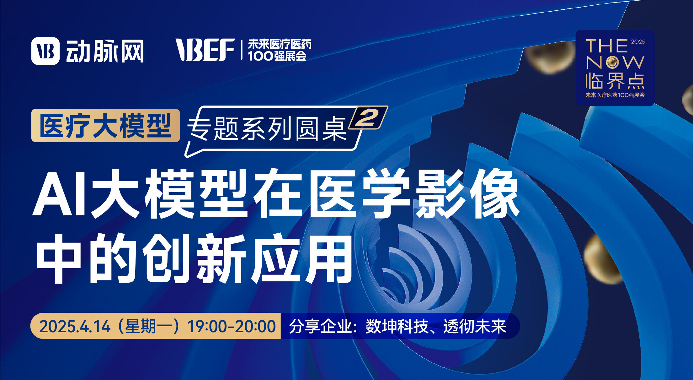 本场直播为医疗大模型专题(第2场),聚焦“医学影像”场景。时间2025年4月14日(星期一)19:00-20:00 。本场分享企业:数坤科技、透彻未来 。