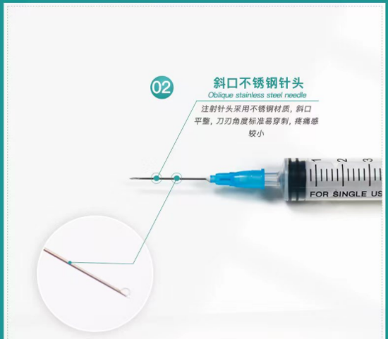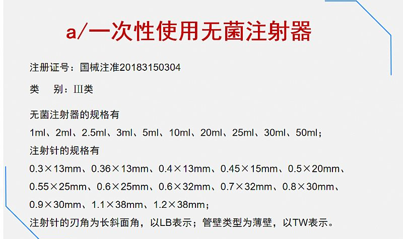 2、注射器的规格有1ml、2ml、2.5ml、3ml、5ml、10ml、20ml、25ml、30ml、50ml;注射针的规格有0.3×13mm、0.36×13mm、0.4×13mm、0.45×15mm、0.5×20mm、0.55×25mm、0.6×25mm、0.6×32mm、0.7×32mm、0.8×30mm、0.9×30mm、1.1×38mm、1.2×38mm;注射针的刃角为长斜面角,以LB表示;管壁类型为薄壁,以TW表示。
