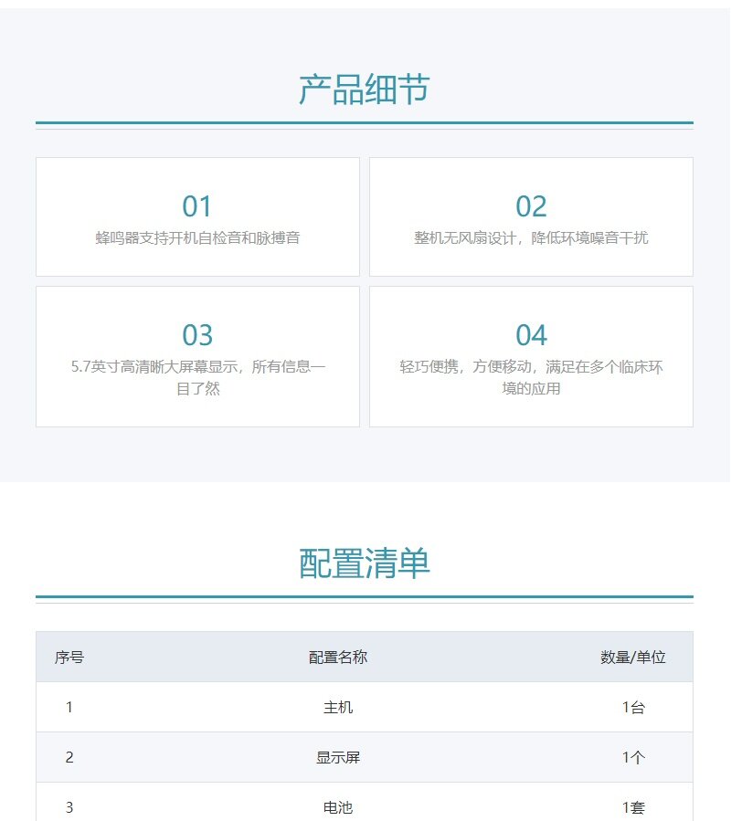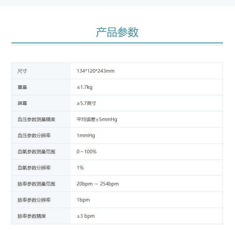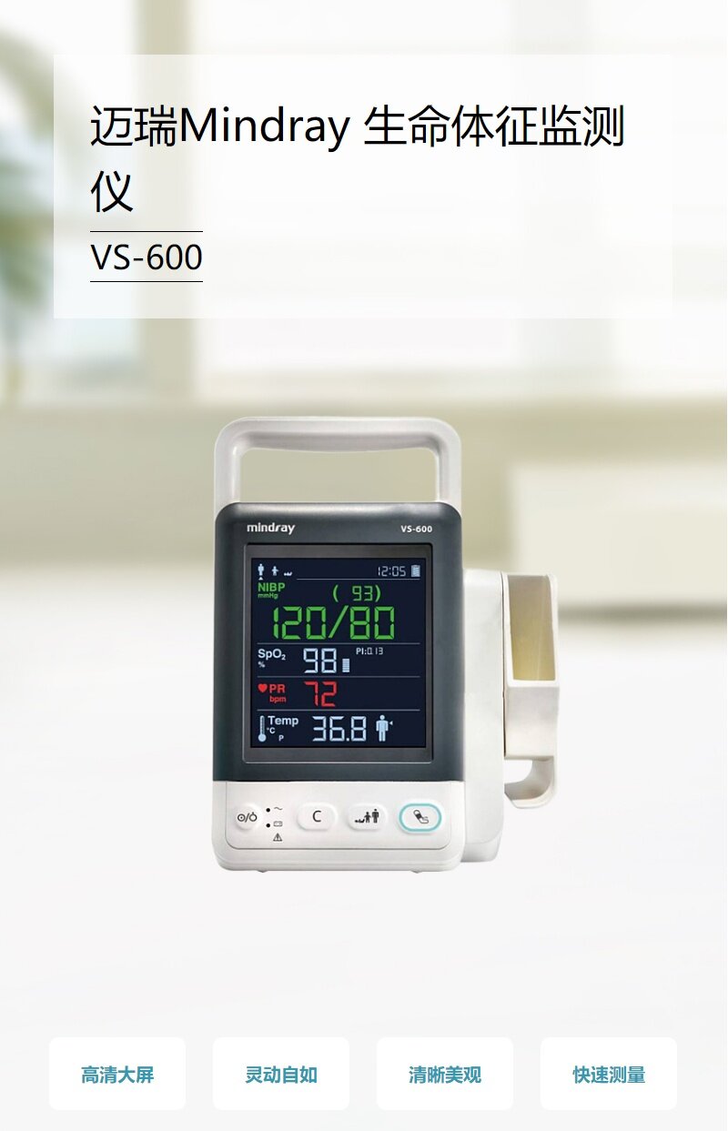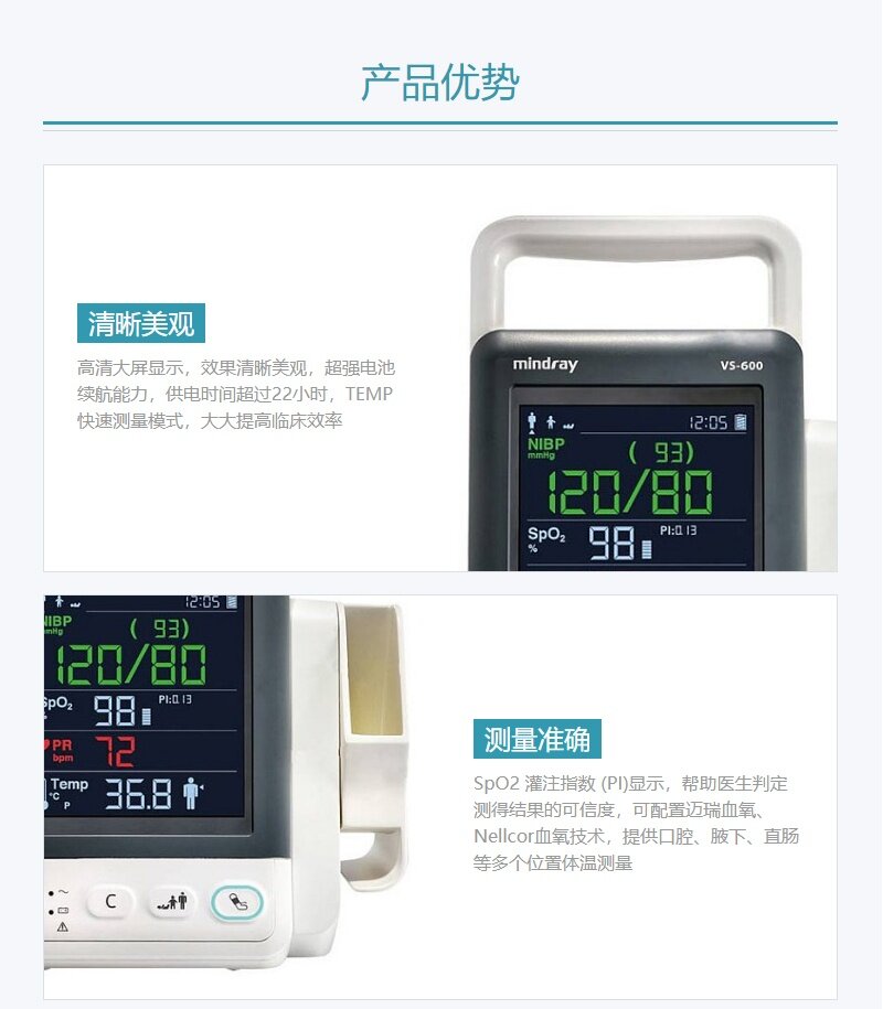 产品卖点:SpO2 灌注指数 (PI)显示,帮助医生判定测得结果的可信度,可配置迈瑞血氧、Nellcor血氧技术,提供口腔、腋下、直肠等多个位置体温测量。