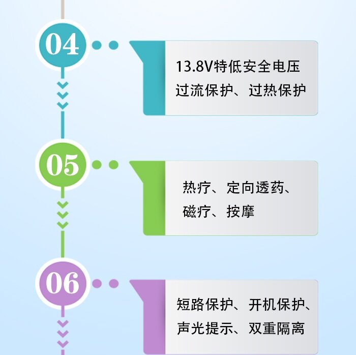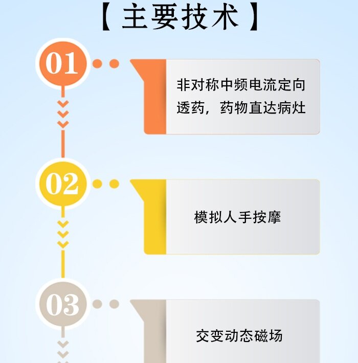 1、五大特点:中频仿生按摩、非对称离子导入、温热治疗、生物磁疗及综合治疗