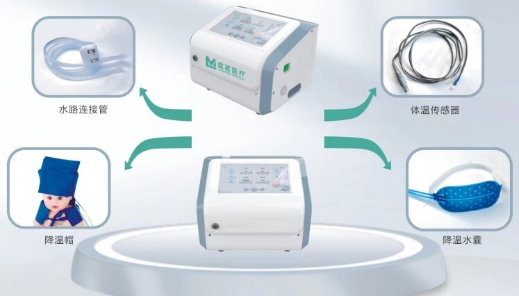 作用原理:通过模块化设计在主机供水口与回水口处接上内循环管路的降温水囊、降温帽,通过半导体、风扇、水泵等进行实时控制,实现降温水囊、降温帽的循环水制冷循环水与患者发生热量交换,达到降温退烧的目的。