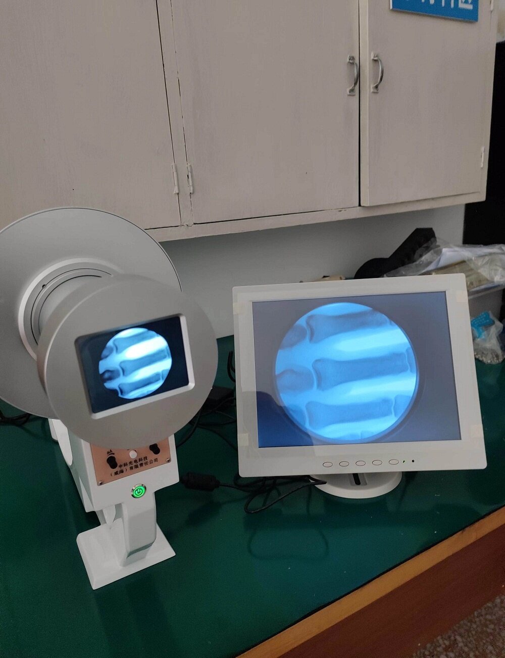 既可以做骨龄仪又可以做骨折复位用的便携式X射线机便携式X光机是一款小型便携的X射线机,X球管电流只有0.5毫安,属于便携高频X射线机,产品自带一个成像屏,可以直接成像,也可根据用户要求连接电脑或连接显示器,产品具有不错的亮度和清晰度,使用不需要暗室。射线剂量很低,对防护的要求不高。
