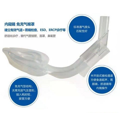 产品卖点:免充气,无需充放气与塑形,更方便;针对无痛胃肠镜检查与治疗而研制,心血管更稳定;用药少,苏醒快,避免术中呼吸抑制、喉痉挛等并发症;舒适化诊疗新选择,可替代气管插管、面罩、鼻氧