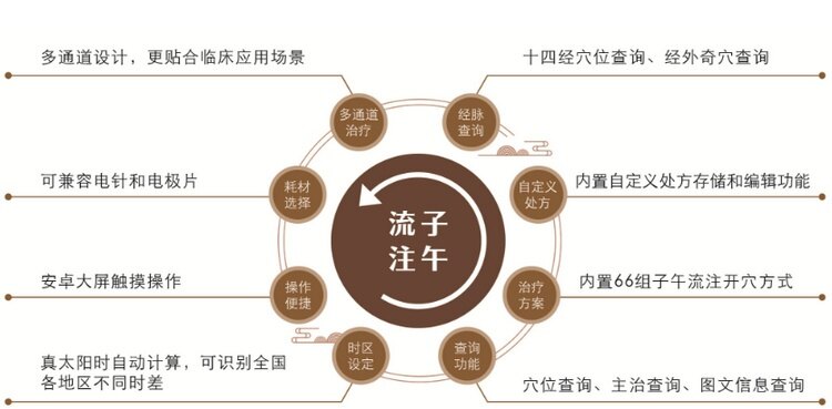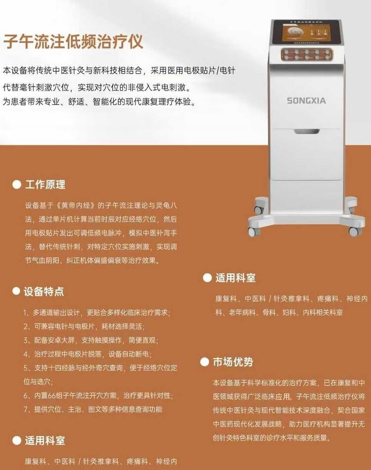 子午流注低频治疗仪由主机、电极片、电极线组成,将传统中医针灸与新科技相结合,采用医用电极贴片/电针代替毫针刺激穴位,实现对穴位的非侵入式电刺激。